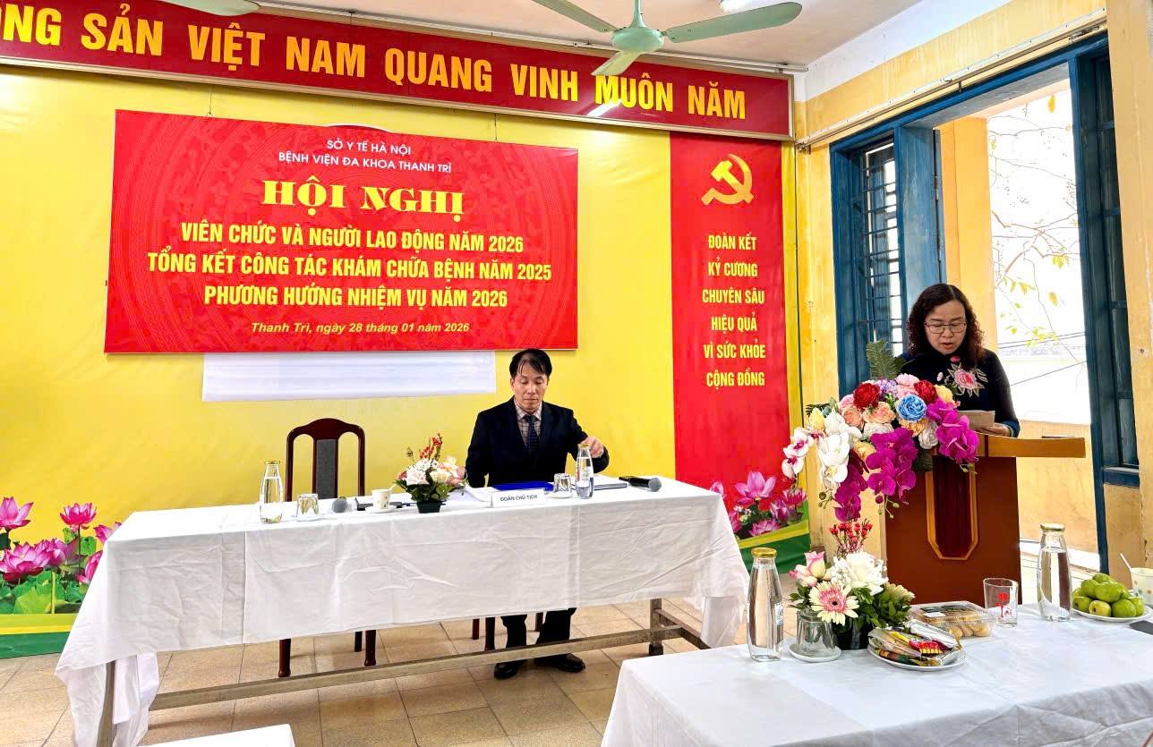 Chiều ngày 28/01/2026 Ban Giám đốc, Ban chấp hành công đoàn Bệnh viện đa khoa Thanh Trì đã phối hợp tổ chức Hội nghị viên chức, người lao động Bệnh viện nhằm đánh giá những kết quả đã đạt được và chỉ ra những tồn tại cần khắc phục của năm 2025. Đồng thời xây dựng kế hoạch chỉ đạo, đưa ra các giải pháp cụ thể nhằm thực hiện tốt nhiệm vụ năm 2026;